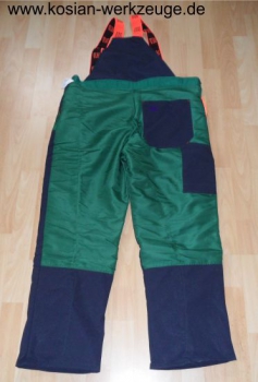 Der Schnittschutz ist wasserdicht abgedeckt. So wird ein Vollsaugen des Schnittschutzmaterials mit Feuchtigkeit und dadurch eine erhebliche Gewichtszunahme vermieden. Saugsperren am Beinabschluss vermeiden lästiges Hochsaugen von Feuchtigkeit.